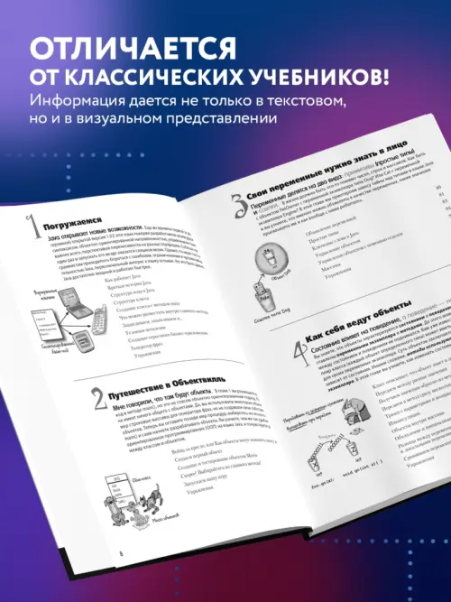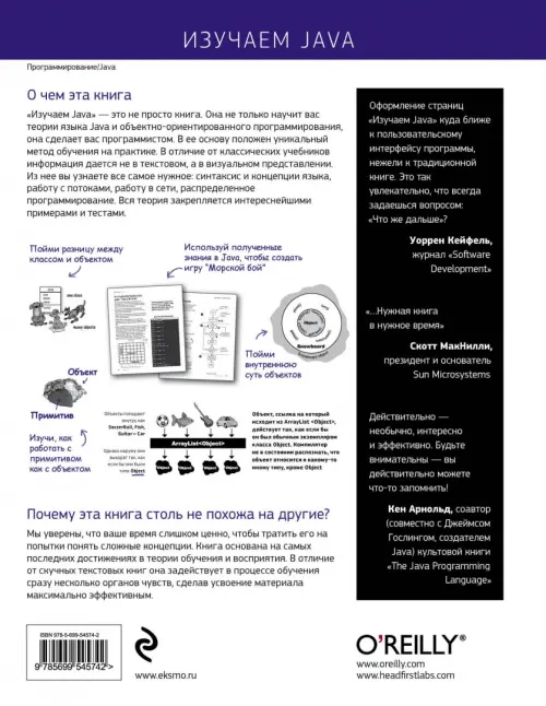 “Изучаем Java” – это не просто книга. Она не только научит вас теории языка Java и объектно-ориентированного программирования, она сделает вас программистом. В ее основу положен уникальный метод обучения на практике. В отличие от классических учебников информация дается не в текстовом, а в визуальном представлении. Вы освоите в деле все самое нужное: синтаксис и концепции языка, работу с потоками, работа в сети, распределенное программирование. Вся теория закрепляется интереснейшими примерами и тестами.