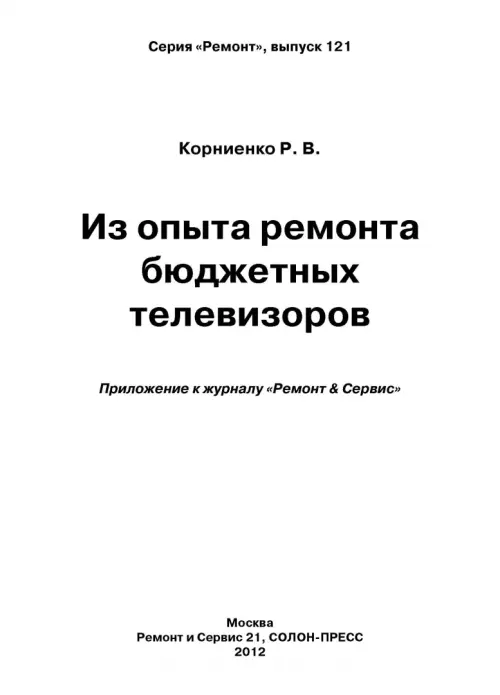 Если вы обнаружили ошибку в описании товара «Из опыта ремонта бюджетных телевизоров» (авторы: Корниенко Руслан Валериевич), то выделите её мышкой и нажмите Ctrl+Enter. Спасибо, что помогаете нам стать лучше!