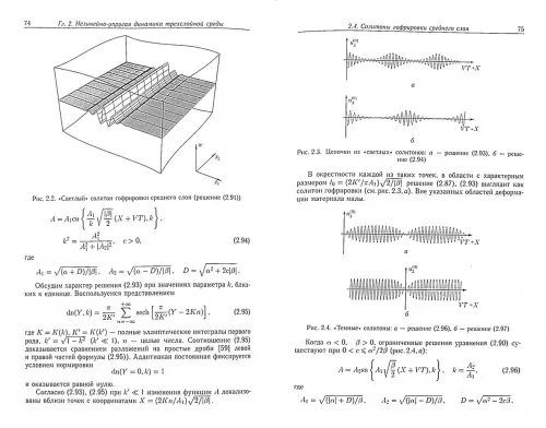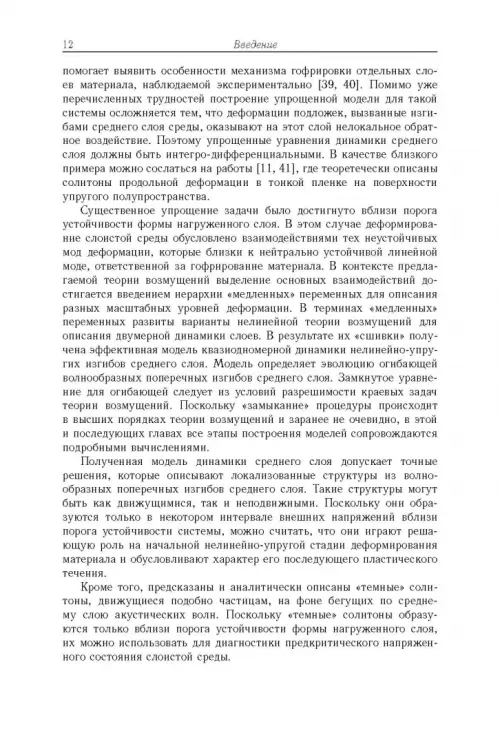 В монографии развиваются специальные варианты редуктивной теории возмущений, которые позволяют привести трехмерные динамические уравнения нелинейной теории упругости для пластин, слоистой среды и оболочек к более простым: двумерным и одномерным моделям. Первые порядки такой теории сводятся к традиционным уравнениям для пластин и оболочек. Получены новые существенно нелинейные модели, которые корректно учитывают граничные условия на поверхностях образцов, взаимодействие продольных и поперечных мод деформации материала, геометрическую и физическую нелинейности среды, изменения инерционных свойств деформируемых поверхностей из-за локальных изменений их кривизны. На этой основе аналитически описаны узоры из вмятин и новые типы солитонов, которые образуются на поверхностях перечисленных систем на начальной (нелинейно-упругой) стадии изменения их формы.