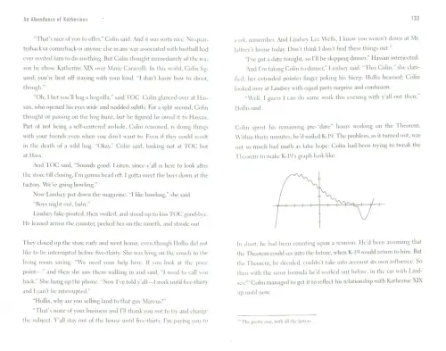 When it comes to relationships, Colin Singleton's type is girls named Katherine. And when it comes to girls named Katherine, Colin is always getting dumped. Nineteen times, to be exact. On a road trip miles from home, this anagram-happy, washedup child prodigy has ten thousand dollars in his pocket, a bloodthirsty feral hog on his trail, and an overweight, Judge Judy - loving best friend riding shotgun - but no Katherines. Colin is on a mission to prove The Theorem of Underlying Katherine Predictability, which he hopes will predict the future of any relationship, avenge Dumpees everywhere, and finally win him the girl.
