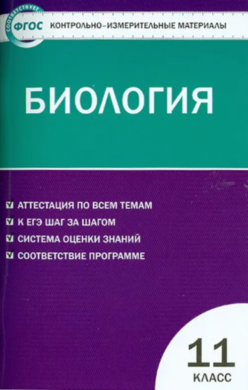 В пособии представлены контрольно-измерительные материалы (КИМы) по биологии для 11 класса. Издание составлено в соответствии с требованиями ФГОС. Структура КИМов аналогична структуре заданий ЕГЭ, что позволит постепенно подготовить учащихся к работе с подобным материалом. В конце издания предложены ключи к тестам.