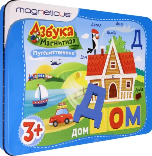 Состав набора: 67 букв, 23 цифры, 16 знаков, карточки с игровыми заданиями на изучение букв и цифр, металлическая коробка, которая одновременно является полем для игры и местом для хранения элементов и буклета.