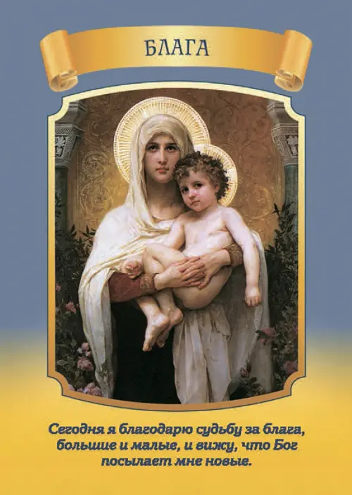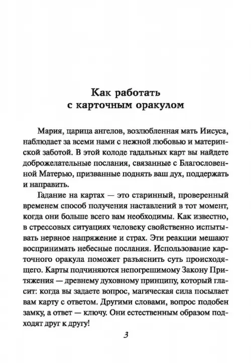 Матерь Божия Мария почитается во всем мире за чистоту ее сострадания, родительской любви и заступничества. Она заботится о каждом из нас и дает нам добрые материнские советы в любых областях жизни. Эти карты содержат послания от Благословенной Матери, призванные воодушевить вас, поддержать и направить в тот момент, когда вам это больше всего необходимо.