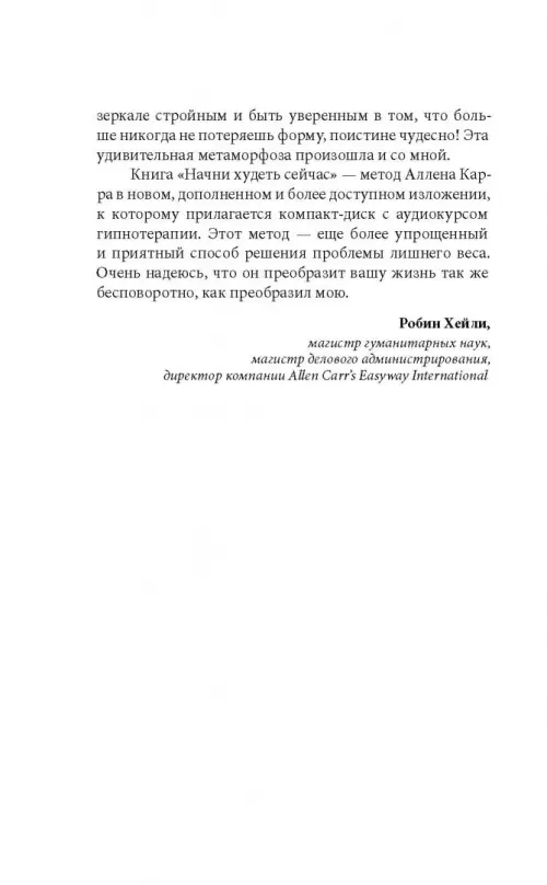 С прилагающимся бесплатным компакт-диском с записью курса гипнотерапии эта книга стала еще более легким, простым и эффективным способом сбросить вес, стать свободным и наслаждаться жизнью.