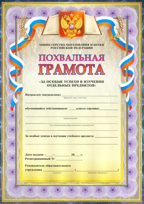 Похвальная грамота "За особые успехи в изучении отдельных предметов" (с пометкой "Министерство образования и науки Российской Федерации")