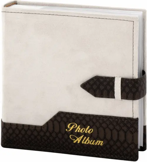 Фотоальбом с обложкой из двух материалов "под кожу рептилии" и "под замшу" контрастных коричневого и бежевого цветов украшен регулируемой по длине застежкой, что, несомненно, привлечет внимание.