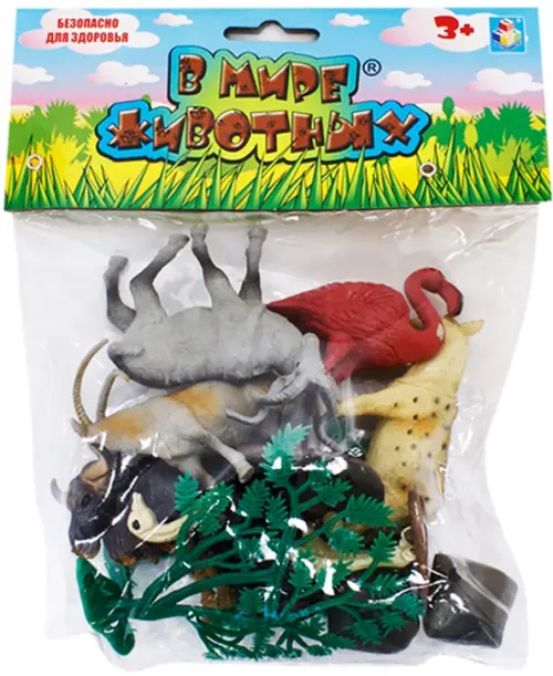 В наборе: 6 фигурок африканских животных, 2 фигурки деревьев, 2 фигурки камней.