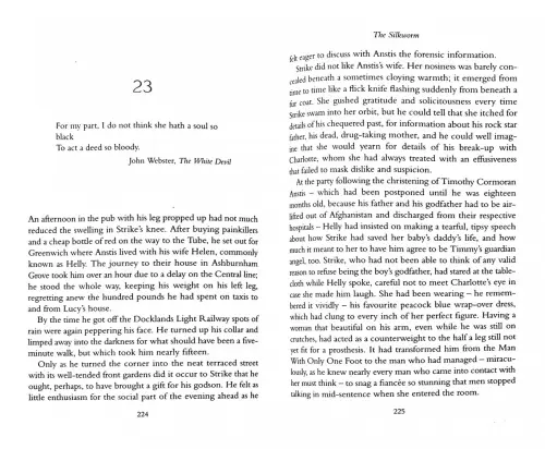 A compulsively readable crime novel with twists at every turn, The Silkworm is the second in the highly acclaimed series featuring Cormoran Strike and his determined young assistant Robin Ellacott.