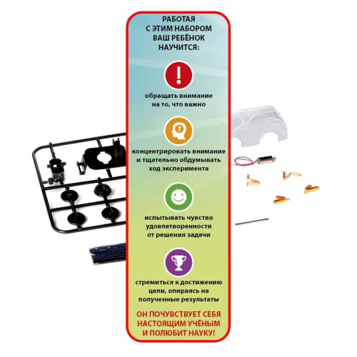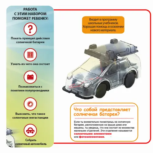 В состав набора входят: рама, крепление для задних колес, ведущая шестеренка, крепление для солнечной батареи, зубчатое колесо, 3 колеса, прозрачный корпус, солнечная батарея, 2 оси, двигатель, 4 клеммы, красочная инструкция.