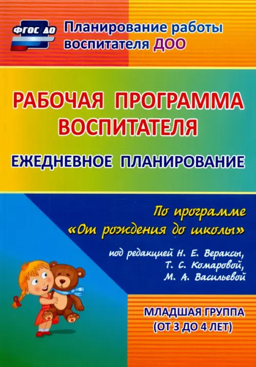 В пособии представлена модель рабочей программы деятельности воспитателя, разработанная в соответствии с ФГОС ДО по примерной общеобразовательной программе дошкольного образования "От рождения до школы" под редакцией Н. Е. Вераксы, Т. С. Комаровой, М. А. Васильевой (М.: Мозаика-Синтез, 2014) для младшей группы (от 3 до 4 лет), охватывающая весь комплекс содержания и организации жизни и воспитания детей в условиях ДОО, планирование культурно-досуговой, совместной деятельности воспитателя и дошколят, взаимодействия с семьями воспитанников. Предложена карта профессиональной компетентности