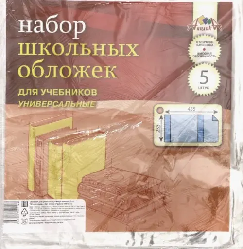 Обложки для учебников универсальные, набор 5 штук, ПВХ, толщина 110 мкм, размер 233х455 мм. Универсальные обложки, с одной стороны клапан, с другой стороны свободная регулировка по ширине, обладают высокой прозрачностью и прочностью. Упаковка - ПЭТ-пакет с цветным вкладышем.