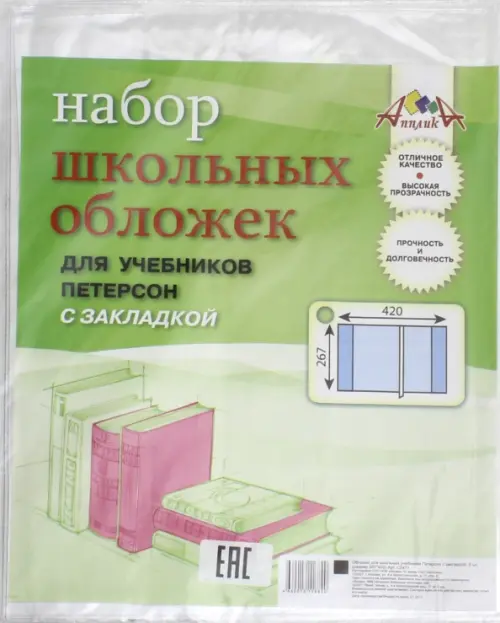 Обложки для учебников Петерсон с закладкой, набор 5 штук, ПВХ, толщина 110 мкм, размер 267х420 мм. Классические обложки с двумя клапанами с закладкой, обладают высокой прозрачностью и прочностью. Упаковка - ПЭТ-пакет с цветным вкладышем.