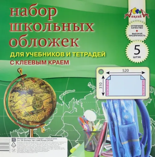 Обложки для учебников и тетрадей, формат А4, с клеевым краем, набор 5 штук, ПВХ, толщина 110 мкм, размер 310х520 мм. С двух сторон нанесен клеевой слой, с защитной пленкой, что позволяет регулировать ширину, обладают высокой прозрачностью и прочностью. Упаковка - ПЭТ-пакет с цветным вкладышем.