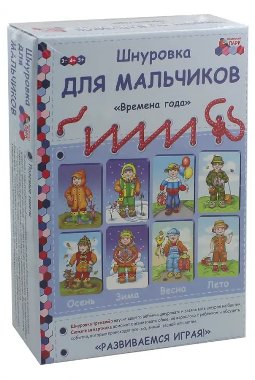 Игровое пособие Шнуровка для МАЛЬЧИКОВ «Времена года» состоит из четырёх двусторонних листов, на которых изображены мальчики на прогулке в разное время года. Одно изображение представляет собой отдельную сюжетную картинку для рассматривания и обсуждения с детьми. Листы имеют отверстия для шнурования. С помощью разноцветных шнурков ребёнок создаёт законченную картинку. Шнуровка выполняется прямыми, наклонными, крестовыми или зигзагообразными стежками. Дети в игровой форме приобретают навыки шнурования и завязывания шнурка на бантик. Шнуровка-тренажёр может быть использована для организации самостоятельной деятельности ребёнка, совместной деятельности с взрослым, а также для подгрупповой работы детей в детском саду. Игровое пособие Шнуровка для МАЛЬЧИКОВ «Времена года» способствует развитию детей по основным направлениям: социально-коммуникативному, познавательному, речевому, а именно: – развивает зрительно-двигательную координацию и мелкую моторику рук; внимание, память, мышление, восприятие, воображение; – формирует навыки шнуровки (шнурование и завязывание шнурка на бантик); – знакомит с временами года и видами одежды и обуви по сезонам; – закрепляет знания основных цветов и их оттенков; – способствует общению и развитию речи, подготовке руки к письму; – содействует формированию гендерной идентичности.