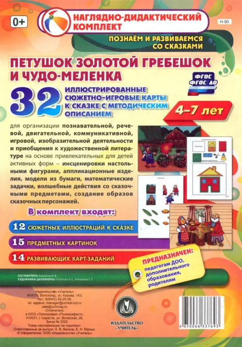Предлагаемый красочно оформленный комплект сюжетно-игровых развивающих карт включает в себя иллюстрации к русской народной сказке "Петушок Золотой гребешок и чудо-меленка" и методические рекомендации, позволяющие педагогам и родителям доступно и увлекательно в совместной деятельности с ребенком не только формировать связную речь, но и способствовать возникновению интереса детей к предметам и явлениям окружающего мира, развивать первичные математические представления. Педагоги и родители в игровой форме, с позиции сказочных персонажей смогут реализовать задачи, поставленные ФГОС, в процессе освоения образовательных областей "Познавательное развитие", "Речевое развитие", "Социально-коммуникативное развитие", "Художественно-эстетическое развитие".