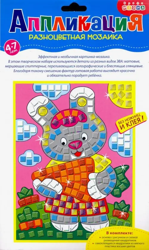 В наборе: основа с рисунком и схемой размещения квадратиков; самоклеящиеся квадратики из мягкого пластика восьми цветов.