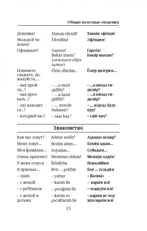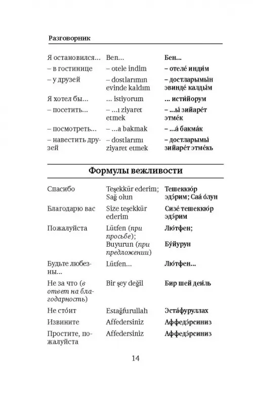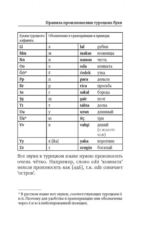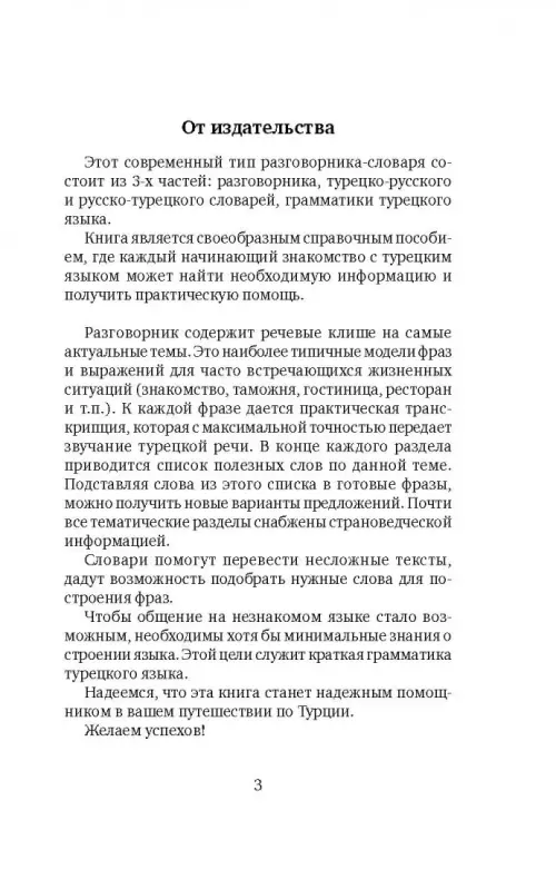 Книга представляет собой современный тип самоучителя и состоит из 4 частей, содержащих самые нужные материалы для обучения иностранному языку: разговорник, турецко-русский и русско-турецкий словари, а также раздел со сведениями по грамматике турецкого языка в предельно простом и понятном изложении.