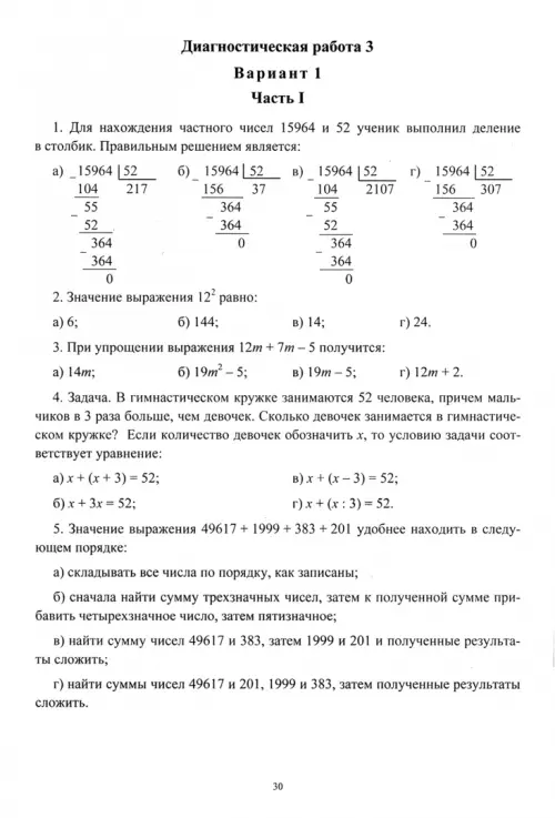 Неоценимую помощь в формировании у школьников умений применять полученные знания в жизни, организовывать свою деятельность, ставить цели и продумывать пути их достижения оказывает современная диагностика образовательных результатов. Именно с этой целью разработаны и внедряются федеральные государственные образовательные стандарты. В этих условиях учителю необходимо иметь четкое представление о том, как должна выглядеть диагностическая работа, в чем отличие диагностической работы от обычной контрольной или самостоятельной работы и, самое главное, как интерпретировать результаты проведенных диагностических работ, самому уметь составлять диагностические карты, позволяющие наглядно отображать индивидуальные успехи и неудачи каждого ученика и класса в целом. Пособие призвано сопровождать педагогов в решении этих проблем. Представлены 5 диагностических работ (по 4 варианта в каждой) для оценки качества освоения программного материала пятиклассниками, диагностические карты, примеры их заполнения и анализа, лист успешности. Предназначено учителям математики, администраторам, составляющим контрольно-измерительные материалы, методистам 00 и студентам педагогических вузов.