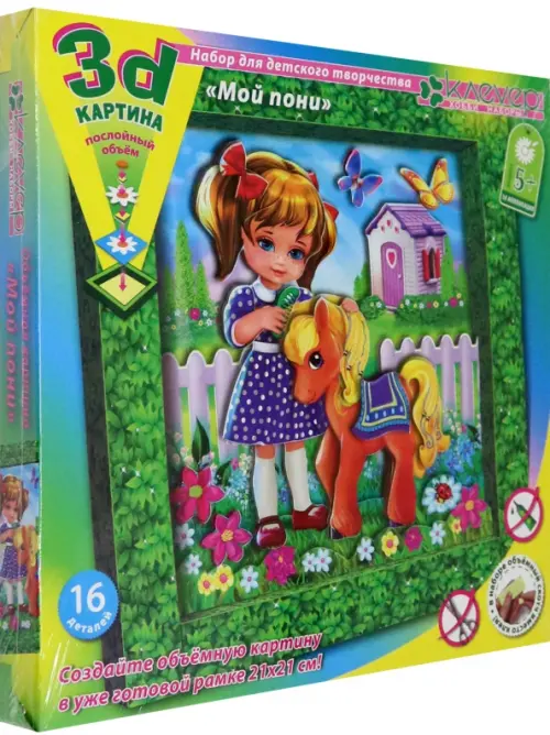 Милая девочка в платье в горошек и ее любимец Пони на яркой цветочной лужайке: объёмная картинка из плоских деталей достигается благодаря эффекту, напоминающему слоёный торт: детали наклеиваются друг на друга и на фон в готовой глубокой рамке с помощью двустороннего клейкого материала на вспененной основе (скотча). Таким образом детали приближаются к зрителю, создается почти диорама.
