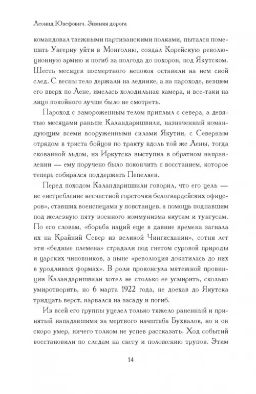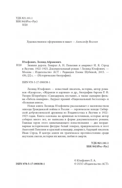 Новая книга Леонида Юзефовича рассказывает о малоизвестном эпизоде Гражданской войны в России — героическом походе Сибирской добровольческой дружины из Владивостока в Якутию в 1922–1923 годах. Книга основана на архивных источниках, которые автор собирал много лет, но написана в форме документального романа. Главные герои этого захватывающего повествования — две неординарные исторические фигуры: белый генерал, правдоискатель и поэт Анатолий Пепеляев и красный командир, анархист, будущий писатель Иван Строд. В центре книги их трагическое противостояние среди якутских снегов, история их жизни, любви и смерти.