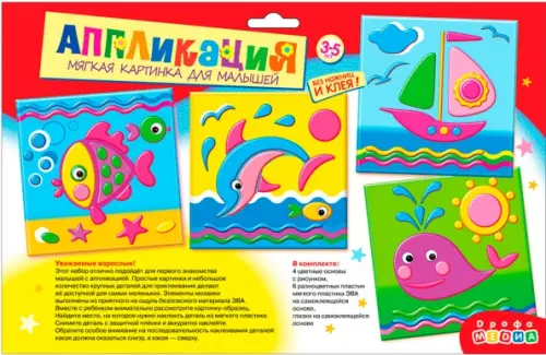 Уважаемые взрослые! Этот набор отлично подойдёт для первого знакомства малышей с аппликацией. Простые картинки и небольшое количество крупных деталей для приклеивания делают её доступной для самых маленьких. Элементы мозаики выполнены из приятного на ощупь безопасного материала ЭВА. Вместе с ребёнком внимательно рассмотрите картинку-образец. Найдите место, на которое нужно наклеить деталь из мягкого пластика. Снимите деталь с защитной плёнки и аккуратно наклейте. Обратите особое внимание на последовательность наклеивания деталей какая должна оказаться снизу, а какая - сверху. В комплекте: 4 цветные основы с рисунком, 6 разноцветных пластин мягкого пластика ЭВА на самоклеящейся основе, глазки на самоклеящейся основе. Материал: картон, мягкий пластик ЭВА. Не рекомендовано детям младше 3-х лет. Содержит мелкие детали. Для детей старше 3-х лет.