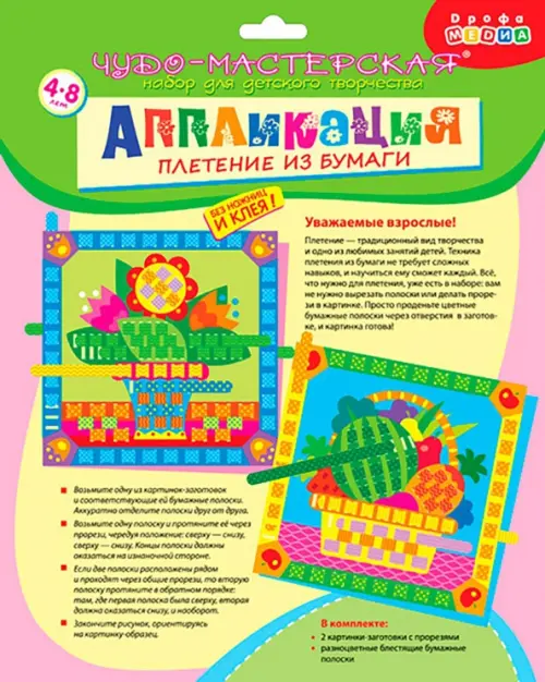 Плетение - традиционный вид творчества и одно из любимых занятий детей. Техника плетения из бумаги не требует сложных навыков, и научиться ему сможет каждый. Всё, что нужно для плетения, уже есть в наборе: вам не нужно вырезать полоски или делать прорези в картинке. Просто проденьте цветные бумажные полоски через отверстия в заготовке, и картинка готова!