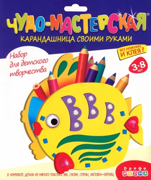 В комплекте: детали из толстого мягкого пластика для сборки карандашницы; детали из мягкого пластика на самоклеящейся основе для украшения карандашницы, стразы, пластмассовые глазки.