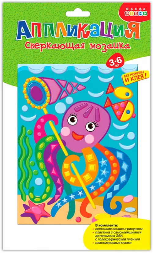 В наборе: цветная основа с рисунком и схемой размещения деталей, детали из ЭВА с голографическим покрытием на самоклеящейся основе, пластмассовые глазки.