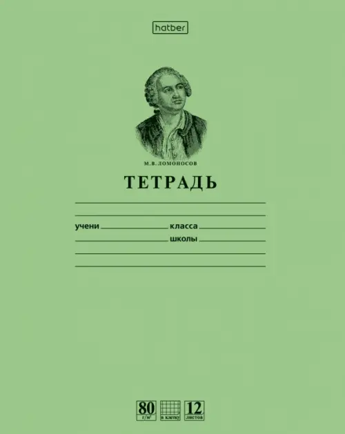 Школьная тетрадь Ломоносов М.В., 12 листов, зеленая (клетка)