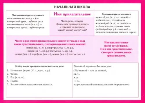 Перед вами справочный материал для начальной школы "Имя прилагательное". Материал удобно расположен, в цветных таблицах, с двух сторон на ламинированном листе А5.