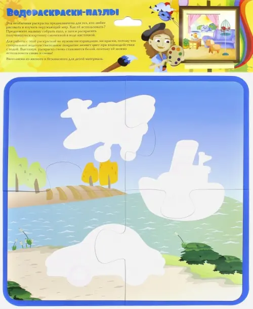 Эта необычная раскраска предназначена для тех, кто любит рисовать и изучать окружающий мир. Как её использовать? Предложите малышу собрать пазл, а затем раскрасить получившуюся картинку смоченной в воде кисточкой. Для работы с этой раскраской не нужны ни карандаши, ни краски, потому что специальное водочувствительное покрытие меняет цвет при взаимодействии с водой. Высохнув, раскраска снова становится белой, поэтому её можно использовать снова и снова! Выполнена из мягкого и безопасного для детей материала.