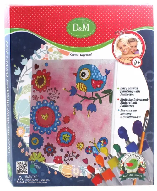 В наборе: холст с контурным рисунком, 6 акриловых красок, кисть, палитра, пайетки.