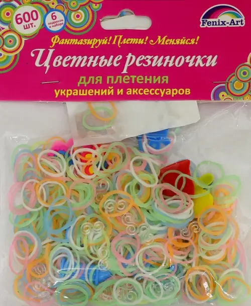 В наборе: 600 резиночек, 24 s-клипс для скрепления, 6 подвесок, пластиковый крючок, держатель-рогатка, инструкция.
