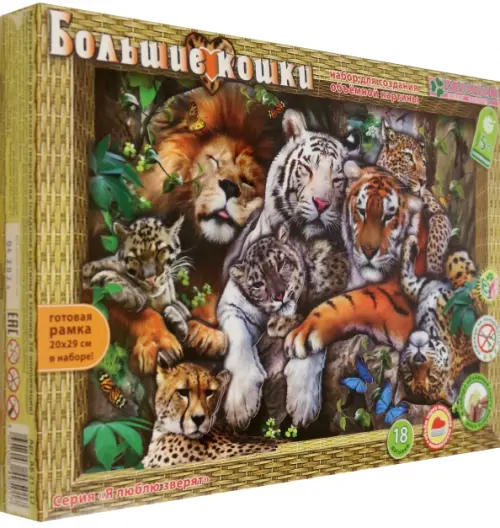Яркую картину "Большие кошки" ребёнок старше 5 лет с помощью взрослых может сделать сам - без клея и ножниц, в технике 3-D аппликации. Лев и тигр, гепард и леопард - их не встретишь вместе в природе. Грациозные, величественные хищники, иногда игривые, как простые кошки, отдыхают на этой картине, словно лучшие друзья. Работая с набором, ребёнок учится складывать трёхмерное изображение из частей, составляя перспективу. Рамку собирать не нужно - красочная и глубокая готовая рамка входит в набор. Клей также не нужен - вместо него в наборе объёмный двусторонний скотч.