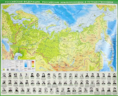 Российская Федерация. Российские землепроходцы и путешественники.Настольная карта. Формат 59х43 см. Масштаб: 1:15 500 000. Двусторонняя ламинация, на плотном картоне.