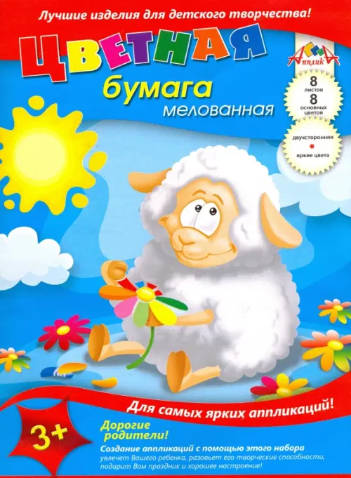 Альбомы и цветная бумагаЕсли вы обнаружили ошибку в описании товара «Цветная бумага мелованная двусторонняя, А4, 8 листов, 8 цветов, "Мечтающая овечка"», то выделите её мышкой и нажмите Ctrl+Enter. Спасибо, что помогаете нам стать лучше!