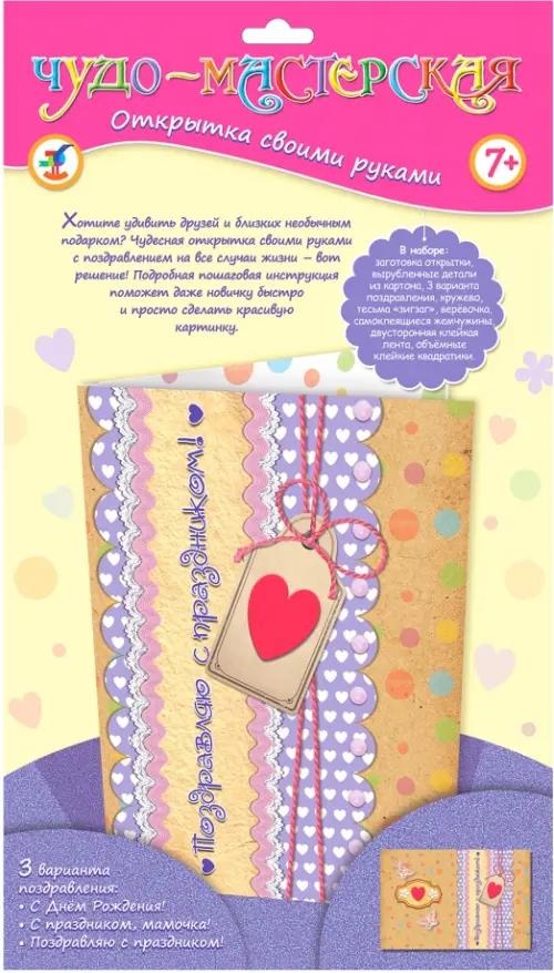 Хотите удивить друзей и близких необычным подарком? Чудесная открытка своими руками с поздравление на все случаи жизни - вот решение! Подробная пошаговая инструкция поможет даже новичку быстро и просто сделать красивую картинку. 3 варианта поздравления: С любовью! С Днем Рождения! Поздравляю! В наборе: заготовка открытки, вырубленные детали из картона, 3 варианта поздравления, самоклеящиеся стразы, объемные клейкие квадратики. Материал: картон, бумага, пластмасса. Упаковка: блистер. Для детей от 7-ми лет. Не рекомендуется детям до 3-х лет. Содержит мелкие детали.