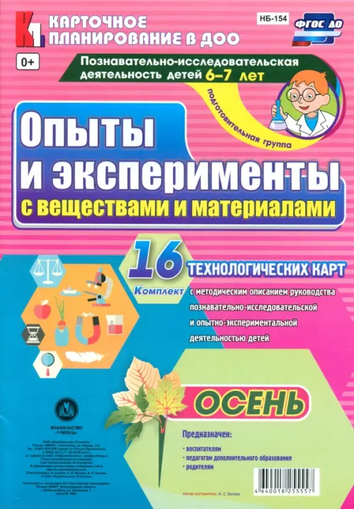 Познавательно-исследовательская деятельность детей. Опыты и эксперименты с веществами и материалами. Осень. Подготовительная группа (от 6 до 7 лет): комплект из 16 технологических карт. Комплект с методическим описанием руководства познавательно-исследовательской и опытно-экспериментальной деятельности детей. Предназначен воспитателям, педагогам дополнительного образования, родителям.