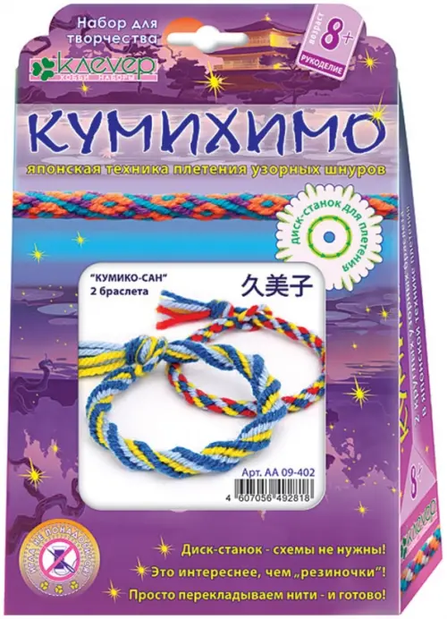 Техника плетения круглых шнуров с затейливыми узорами "кумихимо" появилась в Японии в V веке. Красавицы-японки плели нарядные шнуры-кумихимо из шёлка и золотых нитей и завязывали их поверх поясов-оби на кимоно. Самураи также использовали шнуры-кумихимо, чтобы подвязывать свои одежды и доспехи, так как плетение получалось и красивым и очень прочным. С помощью набора можно сплести два разных по узору и диаметру браслета — для себя и для мамы!