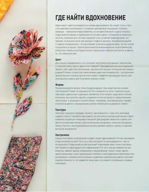 Авторы книги собрали воедино свои знания и преподнесли их читателю в ином свете — представили новые виды бумаги, красок и других материалов, вдохнули новую жизнь в старые техники, оставили в стороне классическую форму цветка и внедрили необычные формы, вдохновленные природой, цветом, материалом и воображением.