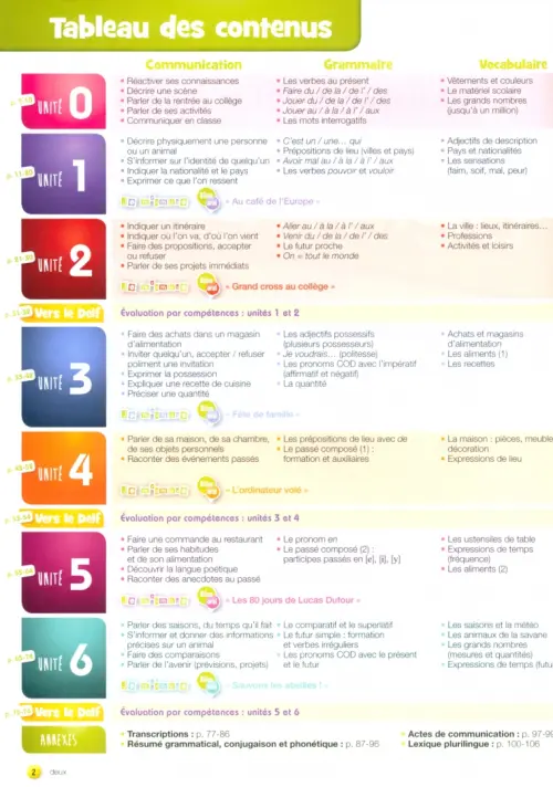- 6 unités de trois leçons, une page de jeux/révisions et un bilan oral;