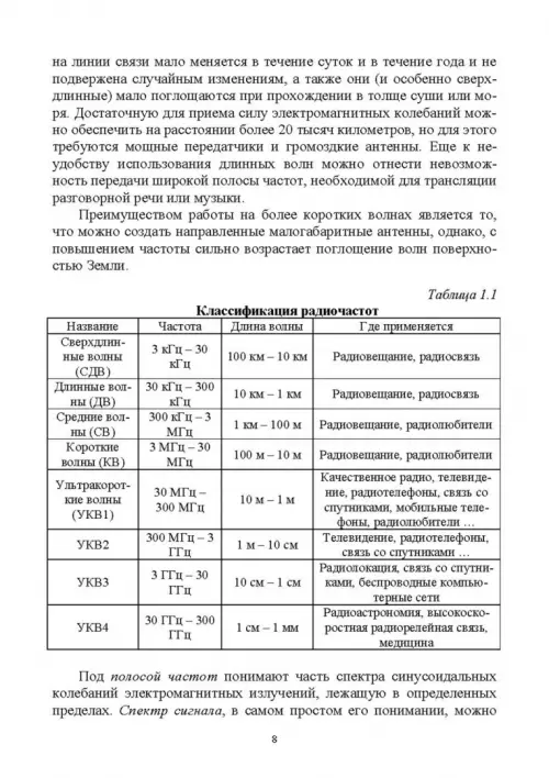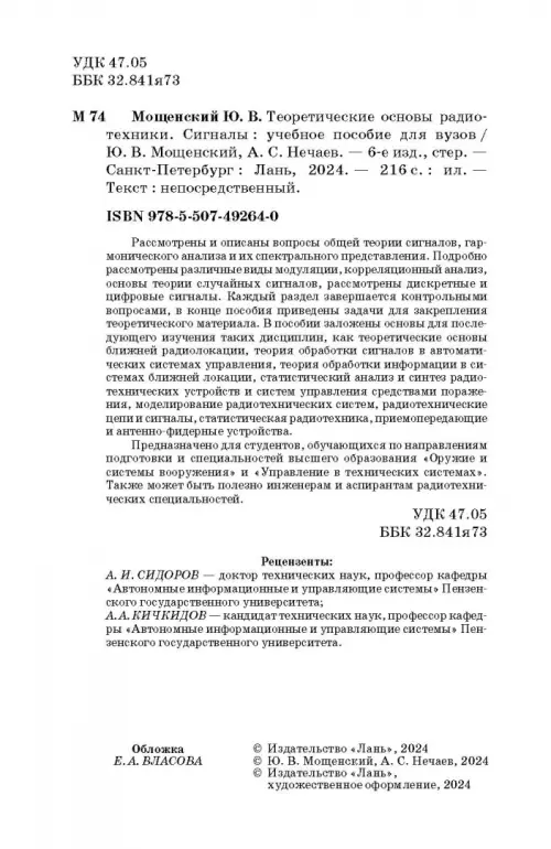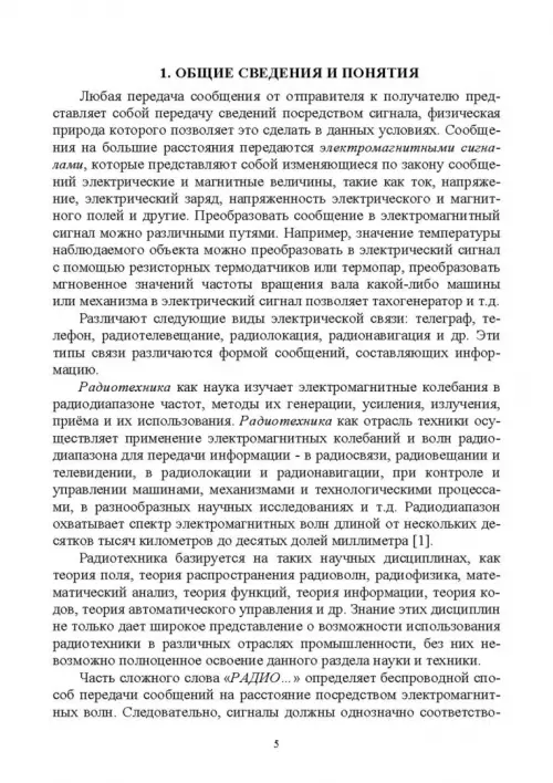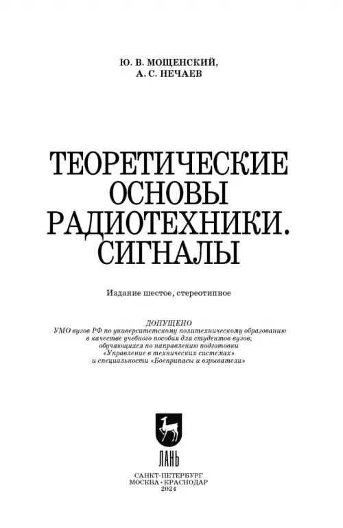 Рассмотрены и описаны вопросы общей теории сигналов, гармонического анализа и их спектрального представления. Подробно рассмотрены различные виды модуляции, корреляционный анализ, основы теории случайных сигналов, рассмотрены дискретные и цифровые сигналы. Каждый раздел завершается контрольными вопросами, в конце пособия приведены задачи для закрепления теоретического материала. В пособии заложены основы для последующего изучения таких дисциплин, как теоретические основы ближней радиолокации, теория обработки сигналов в автоматических системах управления, теория обработки информации в системах ближней локации, статистический анализ и синтез радиотехнических устройств и систем управления средствами поражения, моделирование радиотехнических систем, радиотехнические цепи и сигналы, статистическая радиотехника, приемопередающие и антенно-фидерные устройства. Предназначено для студентов, обучающихся по направлениям подготовки и специальностей высшего образования «Оружие и системы вооружения», «Управление в технических системах». Также может быть полезно инженерам и аспирантам радиотехнических специальностей. Гриф: Допущено УМО вузов РФ по университетскому политехническому образованию в качестве учебного пособия для студентов вузов, обучающихся по направлению подготовки 27.03.04 — «Управление в технических системах» и специальности 17.05.01 — «Боеприпасы и взрыватели».