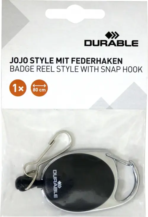 Овальная рулетка для бейджей в стильном дизайне. С металлическим карабином и креплением карабин для простой комбинации с бейджами или с держателями для пропусков.