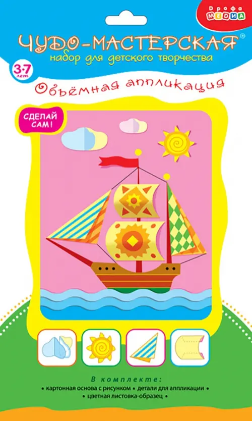Бумагу, как известно, изобрели в Китае, а вот искусство аппликации появилось значительно раньше - на заре человеческой эпохи как способ украшения одежды и обуви. В настоящее время аппликация стала одним из первых видов искусства, который осваивают наши дети. С помощью набора для творчества «Объёмная аппликация» юный творец создаст красочную картинку с объёмными элементами. Поделка проста в исполнении - возьмите уже вырубленные детали картинки, с помощью инструкции сделайте некоторые из них выпуклыми или «плиссированными» и наклейте на картинку-основу. Готовую аппликацию можно не только повесить на стенку в качестве украшения, но и использовать во время игры.