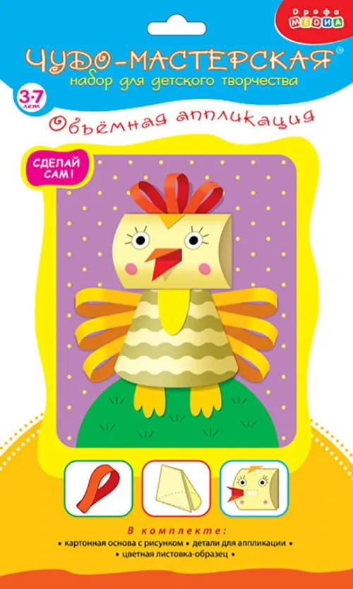 С помощью набора для творчества "Объемная аппликация" юный творец создаст красочную картинку с объемными элементами. Поделка проста в исполнении — возьмите уже вырубленные детали картинки, с помощью инструкции сделайте некоторые из них выпуклыми или "плиссированными" и наклейте на картинку-основу. Готовую аппликацию можно не только повесить на стенку в качестве украшения, но и использовать во время игры.