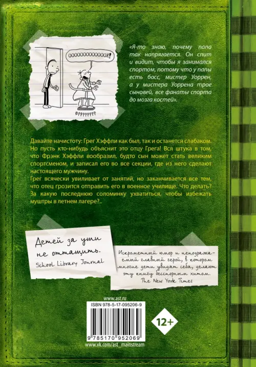 Давайте начистоту: Грег Хэффли как был, так и останется слабаком. Но пусть кто-нибудь объяснит это отцу Грега! Вся штука в том, что Фрэнк Хэффли вообразил, будто сын может стать великим спортсменом, и записал его во все секции, где из него сделают настоящего мужчину. Грег всячески увиливает от занятий, но заканчивается всё тем, что отец грозится отправить его в военное училище. Что делать? За какую последнюю соломинку ухватиться, чтобы избежать муштры в летнем лагере?..