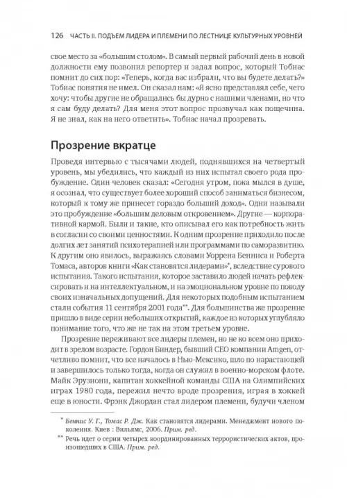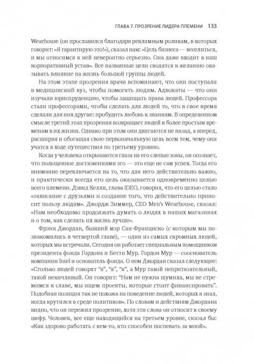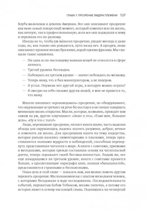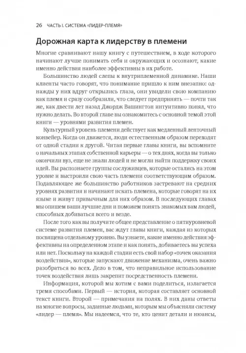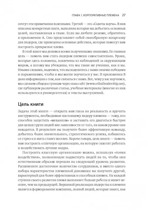 Книга — результат десятилетних полевых исследований с участием 24 тысяч человек из двух дюжин организаций. Но вместо того чтобы засыпать нас цифрами и таблицами, авторы нашли и описали людей, которые олицетворяют собой их идеи и открытия. В результате книга получилась одновременно и информативной, и увлекательной. Они выяснили, чем именно отличаются посредственные корпоративные племена от племен с высокоразвитой культурой. Более того, они обнаружили, что культура племен развивается поэтапно, переходя от одного уровня к другому: от разрушительной агрессивности и эгоцентричности к командному творчеству. Эта книга объясняет нам, почему некоторые племена отвергают любые разговоры о ценностях, характерах и благородстве, в то время как другие буквально требуют проведения таких дискуссий.
