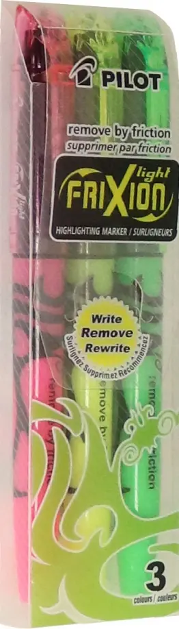 Набор текстовыделителей в прозрачной упаковке. Заправлены термочувствительными чернилами, которые при необходимости можно удалить. Корректировка выполняется с помощью специальной резинки, встроенной в корпус маркера. Нужно немного потереть ей надпись на бумаге, поверхность нагревается под воздействием трения до 60 градусов, и чернила «исчезают», то есть обесцвечиваются, бумага при этом остается невредимой, и можно выделить новое слово или букву. Скошенный наконечник обеспечивает толщину линии от 1 до 3,8 мм.
