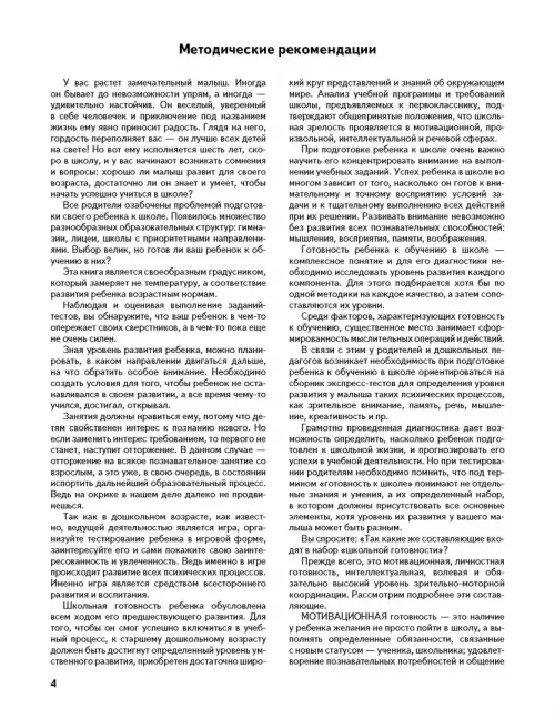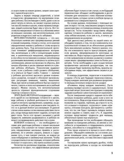 Книга является своеобразным показателем, помогающим определить соответствие развития дошкольника возрастным нормам. Наблюдая и оценивая выполнение заданий-тестов, вы обнаружите, что ваш ребенок в чем-то опережает своих сверстников, а в чем-то пока еще не очень силен. Зная уровень развития ребенка, можно планировать, в каком направлении двигаться дальше, на что обратить особое внимание. Тесты позволяют представить общую картину готовности ребенка к школе, вычленить зоны неблагополучия, если они есть, и начать целенаправленное их развитие. Если вы хотите помочь своему ребенку стать успешным первоклассником - эта книга для вас! Тесты рекомендуются детям старшего дошкольного возраста подготовительных к школе групп, а также массовых и логопедических детских садов. Они окажут неоценимую помощь педагогам, гувернерам и родителям в подготовке детей к первому классу.