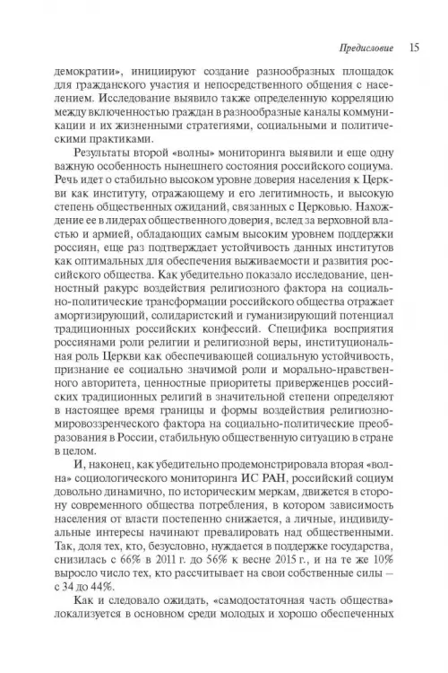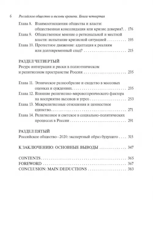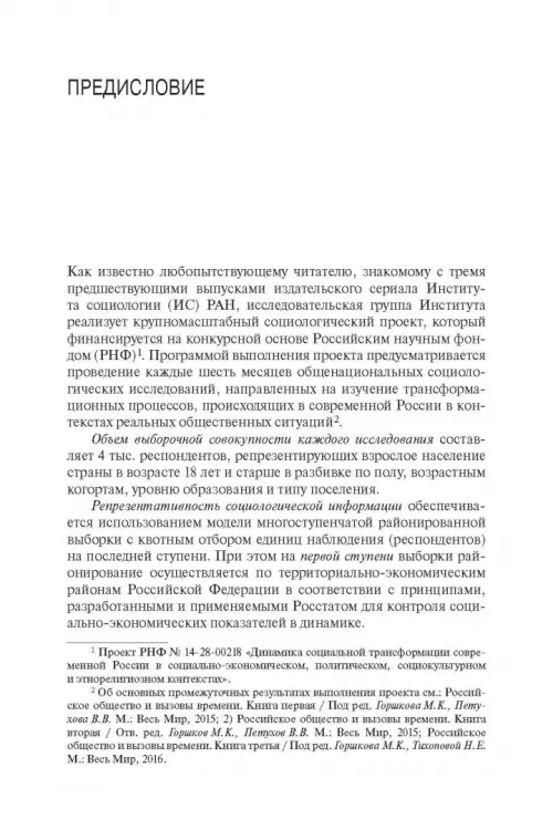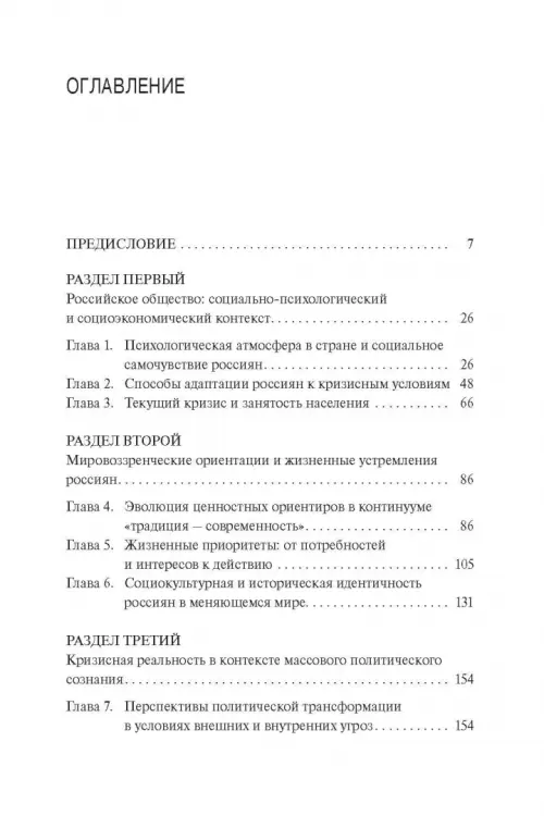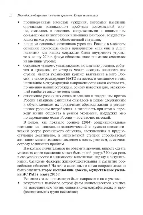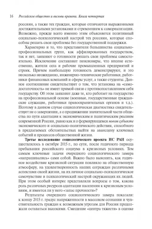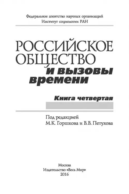 В книге дается многоаспектный анализ результатов четвертой "волны" общенационального социологического исследования состояния и динамики российского общества в контексте новой реальности, обусловленной внешними и внутренними угрозами и рисками. Особое внимание уделяется экономическому и политическому поведению населения в кризисных условиях, устойчивости и изменчивости мировоззренческих ориентаций и жизненных приоритетов россиян, анализу ресурсов социальной интеграции в полиэтническом и религиозном пространстве России. При этом представления о массовом восприятии новой действительности дополняются экспертным анализом перспектив развития российского общества. Для социологов, политологов, философов, экономистов, историков, психологов, правоведов, а также студентов и аспирантов соответствующих специальностей. Предисловие, заключение и оглавление переведены на английский язык и помещены в конце книги.